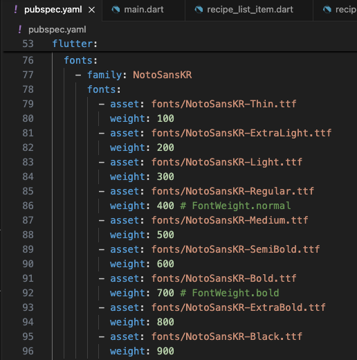 pubspec.yaml파일에서 똑같이 작성해주되, 보통 굵기의 폰트 하나만 넣었다.